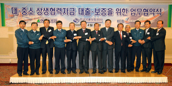 현대중공업은 4월 27일(월) 오후 5시 30분 호텔현대울산에서 한국수출보험공사 및 외환은행과 ‘대-중소기업 상생협력 자금 대출-보증을 위한 업무 협약(이하 ‘상생대출협약’)’을 체결했다.