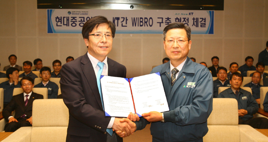 현대중공업은 IT융합을 통한 조선 경쟁력 향상을 위해 지난 29일(수) 울산 본사에서 황시영 전무와 (주)KT 이상훈 부사장 등 관계자들이 참석한 가운데 ‘와이브로(WiBro) 통신망 구축’에 관한 협정을 맺고 상호 협조를 약속했다. (사진:현대중공업은 지난 29일(수) 울산 본사에서 KT와 ‘와이브로 통신망 구축’에