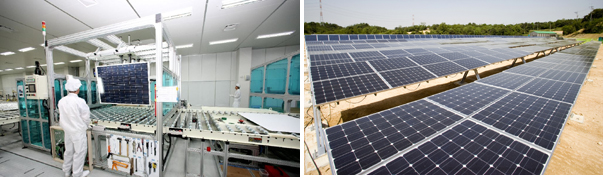 특히 현대중공업은 인증 과정에서 보통 6개월 이상 걸리는 UL의 테스트를 4개월 만에 모두 통과해 제품의 우수성과 기술력을 입증했다. (사진: 현대중공업이 UL인증을 획득한 태양광 발전 모듈(우측)과 음성 태양광 공장)