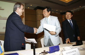 (사진 : 지난 25일 그리스 현지에서 대우조선해양 남상태 사장(오른쪽)과 아티카 그룹 페트로스 베타스 사장(왼쪽)이 계약서에 서명을 한 뒤 악수를 하고 있다)