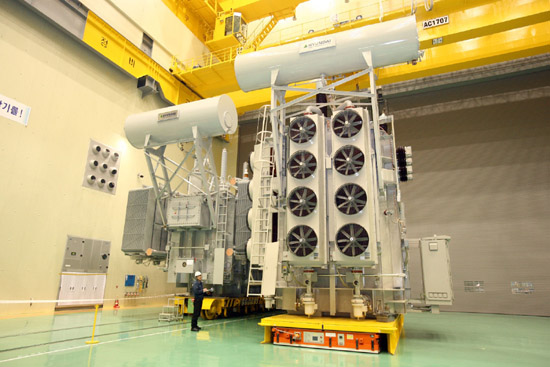 현대중공업은 변압기(사진)와 차단기 등 송전 설비와 각종 중전기기를 제작, 전 세계 70여 개국에 수출하고 있다. 특히 2008년에는 변압기 생산 누계 50만MVA를 달성하고, 단일 공장 세계 최대 규모인 12만 MVA 생산 체제를 갖추는 등 송전 설비 분야에서 빠르게 성장해 왔다.