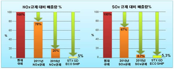 한편 대기 오염원인 선박 배출가스는 그 규제가 점차 강화되어 향후 10년 내 현재 기준 대비 질소산화물 20%, 황산화물 6.7%로 낮춰져야 하며 이 기준에 만족하지 않는 선박은 세계 주요 항구에 운항이 불허된다. 이번에 개발된 STX GD ECO SHIP은 두 성분 모두 5% 로 감소시켜 국제 기준을 완전히 만족하는 친환경 선박이다.