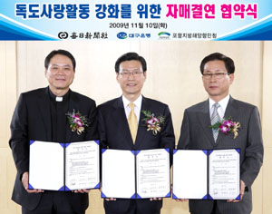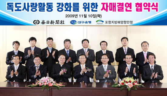 포항지방해양항만청(청장 : 이상진)과 대구은행, 포항항만청, 매일신문 3개 기관은 10일 대구은행 본점에서 자매결연 협약식을 개최하고 우리나라 최동단에 위치한 독도의 국민적 관심을 지속적으로 유발시켜 고유의 우리 땅인 독도에 대한 사랑활동을 강화하기로 했다.