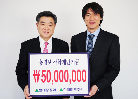 현대중공업은 29일 서울시 종로구 계동 현대빌딩에서 축구 꿈나무 육성을 위해 써달라며 홍명보 이사장에게 현대중공업 3천만 원과 현대미포조선 2천만 원의 성금을 전달했다.