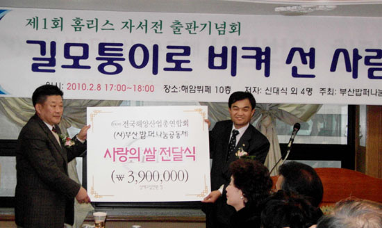 전국해양산업총연합회(회장 이진방)는 2010 교통물류 해양산업 경제인합동 신년인사회에서 화환대신 쌀을 받아 모금한 성금을 2월8일 해양도시 부산에서 결식자를 대상으로 무료 급식사업을 전개하고 있는「부산 밥퍼 나눔공동회」측에 전달했다.