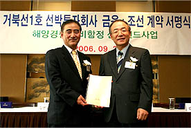 산업은행은 2004년 이후 14개 선박펀드에 선박금융을 제공하는 등 선박금융시장의 마켓리더로서 선도적 역할을 수행함으로써 선박금융제도 정착에 앞서왔고, 이번 사업도 국책은행으로서 입안단계에서부터 자문 전담직원을 지정하여 사업구조 등에 대한 자문을 해왔다고 설명했으며, 신동혁 산은 프로젝트파이낸스실장은 "향후 계속사업을 고려할 때, 본 사업이 정상궤도에 오를 수 있도록 산은이 이 사업에 주도적으로 참여하는 것이 사업의 안정성과 예산절감 측면에서 타당하다고 판단했다"고 본 금융약정에 대한 의미를 부여했다. (사진: 왼쪽 한국선박운용 김연신 대표이사, 오른쪽 : 한국산업은행 이상권 이사)