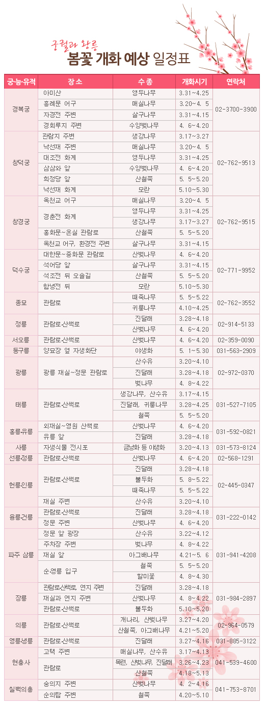'궁궐과 왕릉 봄꽃 개화 예상 일정표'는 문화재청 홈페이지(보도자료)에서 확인할 수 있다.