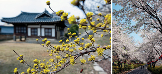 강화도령 철종의 생가인 용흥궁 뒤란에 산수유꽃이 꽃망울을 터뜨리기 시작했다(왼쪽). 강화산성 북문으로 오르는 길의 화사한 벚꽃터널.