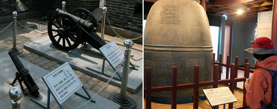 강화도의 관문이었던 갑곶의 갑곶돈대(왼쪽). 조선 숙종 37년(1711년)에 주조된 강화동종(銅鐘).