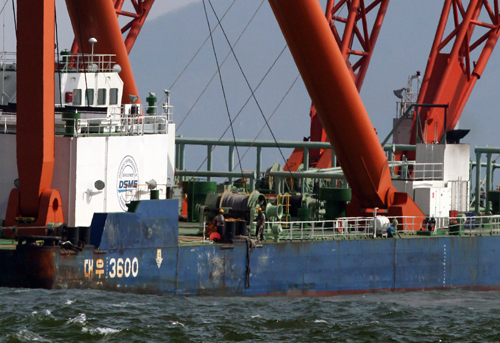 (사진:함수 인양을 위해 투입된 3천600t급 크레인선 ‘대우 3600호’가 9일 오후 백령도 함수 침몰 해역에 선체를 고정시키는 작업중에 있다)