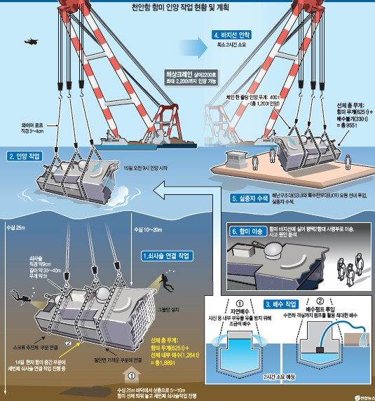 ■ 인양작전= 국방부는 함수와 함미 중 함미 부분을 우선 인양하는 데 역량을 집중하기로 했다. 실종자가 함미 부분에 다수 있을 것으로 추정되기 때문이다. 기상 상황이 호전될 경우 함미 인양은 15일, 함수 인양은 24일 이후 가능할 전망이다. 함미를 인양한 후 바닷물을 빼내고 바지선에 탑재해 실종 장병을 수습하는 데 11시간 정도가 소요될 것이라는 예상이다.
