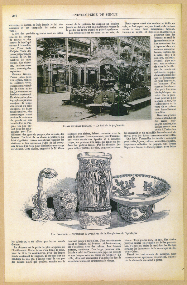 ‘프티 주르날’은 당시 한국관 전시물이 “국왕이 직접 보내온 값진 수집품들과 한국에 거주했던 프랑스인 소유의 소품들, 그리고 한국산 제품들이 세련되게 배치되어 있어 한국의 자원과 산업에 대한 전반적인 인상을 강하게 심어준다”고 평가했다.