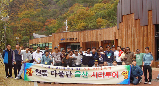 현대중공업 사내 동아리인 현중다물단(단장: 姜외철)은 6월 27일(일) 사내 협력회사에 근무 중인 외국인 31명을 초청해 울산 지역 유적지를 탐방하고 고유 풍속놀이를 체험하는 「우리문화 알리기 및 고유 풍속놀이 체험행사」를 가졌다.(사진: 지난해 현중다물단이 마련한 외국인 근로자 문화체험 행사 모습)