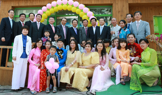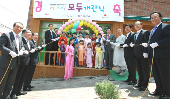 다양한 문화가 모두 모인다는 뜻의 다문화어린이도서관 ‘모두’는 국내 거주 외국인 100만 시대를 맞아 다양한 국가의 문화가 자연스럽게 소통하는 공간으로 자리매김했다. (사진:STX그룹의 네 번째 다문화어린이도서관인 ‘모두’ 구미점이 7일 개관했다. 사진은 개관식에 참석한 강덕수 STX그룹 회장(사진 왼쪽에서 6번째), 김관용 경상북도 지사(사진 왼쪽에서 7번째), 남유진 구미시장(사진 오른쪽에서 5번째), 김성조 국회의원(사진 오른쪽에서 6번째) 등 주요 외빈 및 다문화가정 어머니들과 어린이들이 기념촬영을 하고 있다)