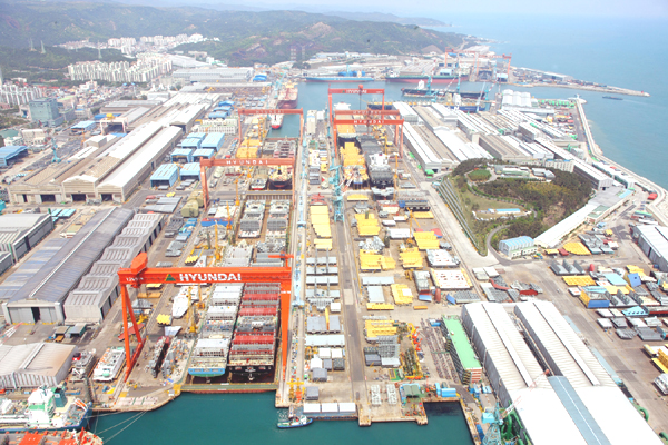 현대중공업이 구축한 이 시스템은 ETRI(한국전자통신연구원)에서 지원하는 국책과제의 일환으로, 4단계에서 최다 13단계에 이르는 사외 협력사 간 임가공 과정에서 발생하는 자재의 출하, 도착, 입고 등의 흐름과 제작·공정의 정보를 2차원 바코드에 담아 개선한 것이다. (사진:현대중공업 야드 전경)