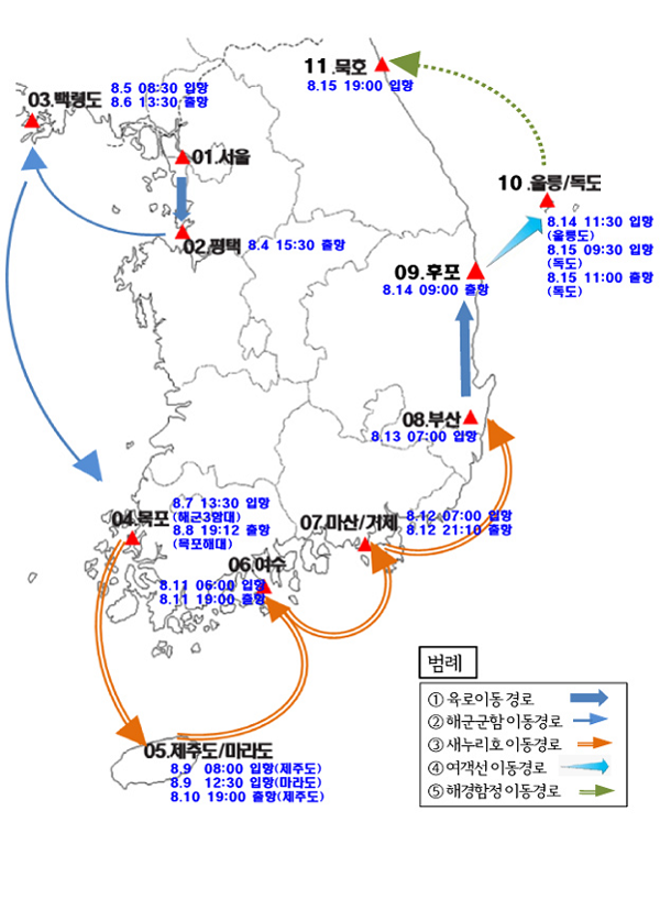 해양영토대장정은 4일 평택항을 출항하여 오는 17일 묵호항에서 귀항식을 갖고 마무리를 하게 된다.