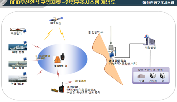 한편, 해양경찰청에서 구축중인 RFID단말기 이용 해양인명구조시스템은 지난 2007년 해양경찰청과 중소기업이 공동으로 개발한 것으로, 위치추적단말기(RFID 단말기)를 장착한 구명조끼 착용시, GPS 및 관제시스템을 통해 조난자의 위치 및 단말기 보유 선원의 인적사항을 정확하게 수신 가능하므로 조난신호를 수신 받은 수색선 또는 수색헬기에서 야간에도 신속하게 인명을 구조할 수 있는 시스템이다. 현재, 해양경찰청에서는 1,000톤급 이상 해경함정 16척에 보급되어 활용중이며(수신기 16대, 단말기 320개), 올해 250톤급 해경함정까지 수신기 보급을 확대할 계획으로 알려져 있다.