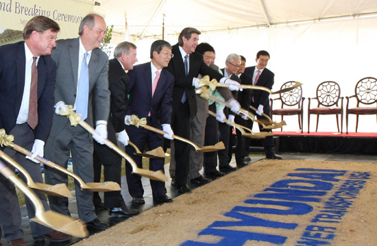 (사진:지난 17일(현지시간) 美 앨라배마주 몽고메리시에서 열린 현대중공업 미국 변압기 공장 기공식에서 이재성 사장(왼쪽 4번째), 밥 라일리 앨라배마 주지사(왼쪽 5번째) 등이 첫 삽을 뜨고 있다)