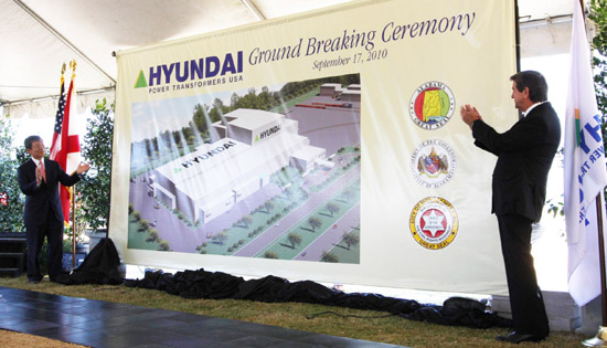 (사진: 현대중공업 미국 변압기 공장 기공식에서 이재성 현대중공업 사장(왼쪽)과 밥 라일리 앨라배마 주지사(오른쪽)가 조감도에 씌워진 막을 걷어내고 박수를 치고 있다)