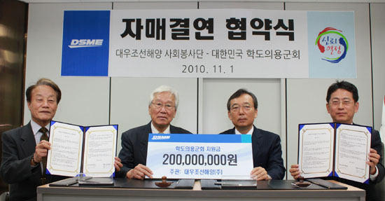 대우조선해양(대표 남상태)은 1일 회사 내 봉사단체를 통해 대한민국 학도의용군회와 자매결연식을 갖고, 이 회에 소속한 학도의용군 출신 독거노인과 생활이 어려운 가정 100여 세대를 지원하기로 했다.