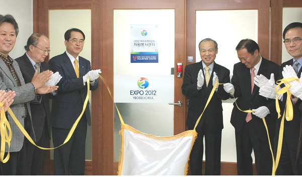 2012여수세계박람회 조직위원회(위원장 강동석)는 8일 서울 종로구 계동 조직위 사무실에 ‘2012여수세계박람회 자원봉사센터’를 개소했다. (사진: 왼쪽에서 세번째 이제훈 한국자원봉사협의회 상임대표. 네 번째 강동석 여수세계박람회 조직위원장)