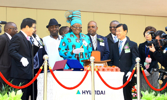 현대중공업은 지난 2008년 2월 프랑스 토탈(Total)社로부터 수주한 저장용량 200만 배럴급 초대형 FPSO를 성공적으로 건조, 지난 11일(목) 울산 본사에서 명명식을 가졌다. (사진:현대중공업 강창준 해양사업본부장(앞줄 오른쪽 첫번째),나이지리아 석유공사 그룹장 부인인 비비안 오니원(VIVIAN ONIWON, 앞줄 오른쪽 두번째), 프랑스 토탈사 존 아데(ADDEH) 부사장(뒷줄 오른쪽 세번째)