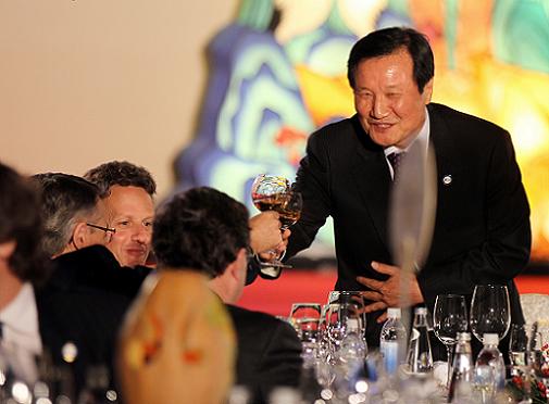 온다로도는 특히 서구인의 독점물처럼 생각되던 세계 와인업계에 한국 기업인이 세심한 정성과 노력으로 일궈낸 성공 스토리로 주목을 받았다. (사진:지난 22일, 경주 G20 재무장관·중앙은행 총재회의 후 경북 경주 안압지에서 열린 대표단 환영만찬에서 윤증현 기획재정부 장관이 참석자들과 건배를 하고 있다)