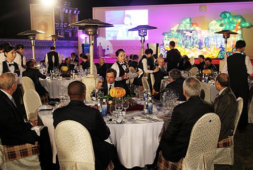 이 단장은 “서울 회의에서는 가정집에 초대된 듯 편안한 느낌을 주도록 음식을 구성해 서민적이고 정감있는 ‘프렌치 어니언 수프’ 등을 메뉴에 넣었고, 스테이크가 서빙되는 동안 식지 않도록 파이로 싸서 구운 소고기 안심 메인요리 등도 선보인다.”고 설명했다. (사진:경주 G20 재무장관·중앙은행 총재회의 대표단 환영만찬 모습)