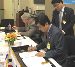 (사진: 16일(현지시간) 오일메이저 업체의 본사에서 열린 수주 계약식에서 대우조선해양 남상태 사장(오른쪽)이 탐사 프로젝트(E&P) 총책임자(왼쪽)와 함께 수주 계약서에 서명하고 있다)