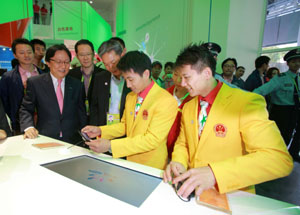 특히 삼성홍보관을 방문한 학생들은 중국 삼성 박근희 사장에게 편지와 직접 만든 종이 공예품을 선물하며 감사의 마음을 전했다. (사진: 중국체조 국가대표팀이 삼성홍보관에서 첨단IT 기기를 체험하고 있다)