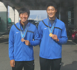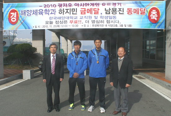 한국해양대학교(총장 오거돈)는 지난 20일 2010 광저우 아시안게임 요트남자 국제레이저급 금메달리스트인 해양체육학과 소속 하지민(3년 사진 우측) 선수와 오픈 매치레이스 동메달리스트 남용진(2년 사진 좌측) 선수를 축하하기 위해 25일 전 교직원 및 학생들에게 무료 점심을 제공했다.