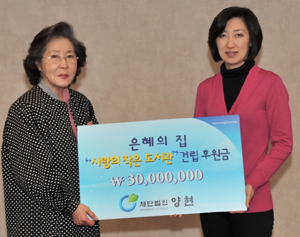 양현재단(이사장 최은영 사진 우측 / 한진해운 회장)은 7일 부산에 위치한 아동보육시설 은혜의 집(원장 우행자 사진 좌측)에 도서관 건립을 위한 후원금을 전달했다.