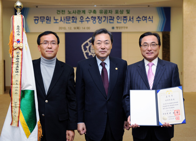 행정안전부는 올해부터 모범적인 노사문화를 만든 행정기관을 선정해 인증하는 제도를 마련한 가운데 이들 기관에 우수한 노사협력 노하우를 전수한 현대중공업을 유공기업으로 선정, 포상했다.