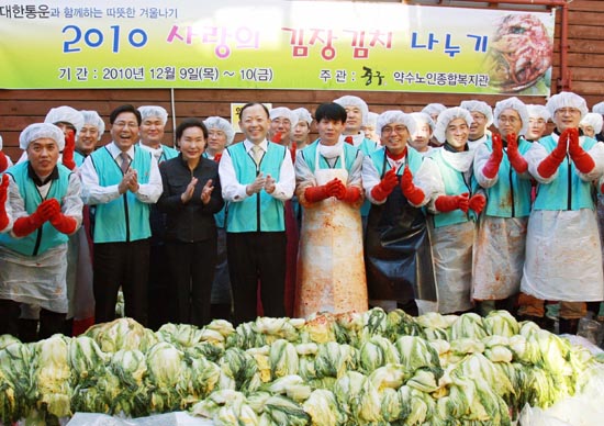 (사진:대한통운 노사는 9일과 10일 양일에 걸쳐 서울 중구 지역 소외계층 가구에 김장김치 2천여 포기를 직접 담가 전달하는 '사랑의 김장김치 나누기'행사를 가졌다. 임직원 1백여 명이 참여했다. (왼쪽 세번째부터)김장을 담그고 있는 서재환 대한통운 사회봉사실천단장(전무), 나경원 한나라당 의원, 차진철 대한통운 노조위원장)