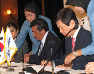 대우조선해양(www.dsme.co.kr, 사장 남상태)이 동남아 국가로부터 함정 건조협약을 체결하며 올해 수주목표인 100억 달러를 돌파했다. (사진 : 대우조선해양 남상태 사장 (오른쪽)과 현지 조선업체 대표가 14일 오후 해군 함정 건조 계약서에 서명을 하고 있다)