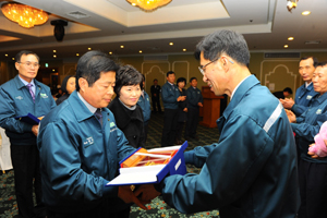 현대중공업은 올 해 연말로 정년 퇴직자 수가 총 950명으로, 창사 38년 이래 가장 많은 인원이 될 것이라고 지난 15일(수) 밝혔다. 이 같은 수치는 역대 최다였던 지난해 정년퇴직자 675명보다 무려 275명이나 늘어난 것이다.(사진:정년 퇴임식에 참석한 한 직원이 기념품을 받고 있다)