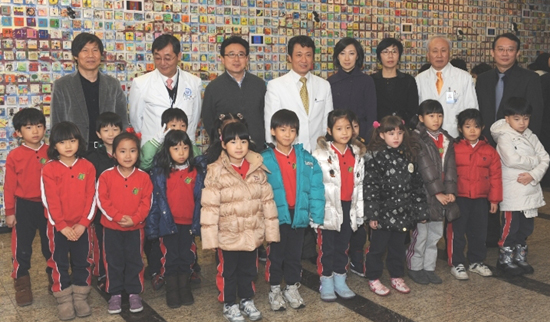 명지병원은 15일 ‘희망의 벽’ 제막식을 열고 환아와 보호자들에게 작품을 선보이는 자리를 가졌다. '희망의 벽'은 환아들에게 희망을 전하고 완쾌 의지를 북돋고자 하는 목적으로 양현재단의 작품제작비 후원과 강익중 작가의 작품 기증으로 이루어진 것으로, 국내뿐 아니라 세계 각국 어린이들의 꿈과 소망이 고스란히 담긴 3.3인치의 작은 그림들이 모여 하나의 벽화로 탄생하는 설치 미술작품이다. 이번 희망의 벽은 명지병원 1층 로비에 가로 11.5m 세로 2.75m 크기로 설치됐다. (사진:제막식 행사에 참석한 초록유치원 어린이들이 축하공연을 펼치고 있다)