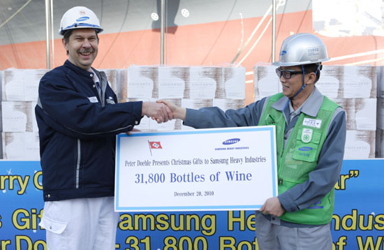 독일 해운사인 피터돌레社가 칠레의 직영 농장에서 수확한 포도로 만든 와인 'Calicanto'(칼리칸토) 31,800병을 삼성중공업 전 직원들에게 크리스마스 선물로 전달했다. (사진:와인 전달식에서 악수하는 하인시우스 피터돌레社 수석감독관과 삼성중공업 박대영 조선소장)