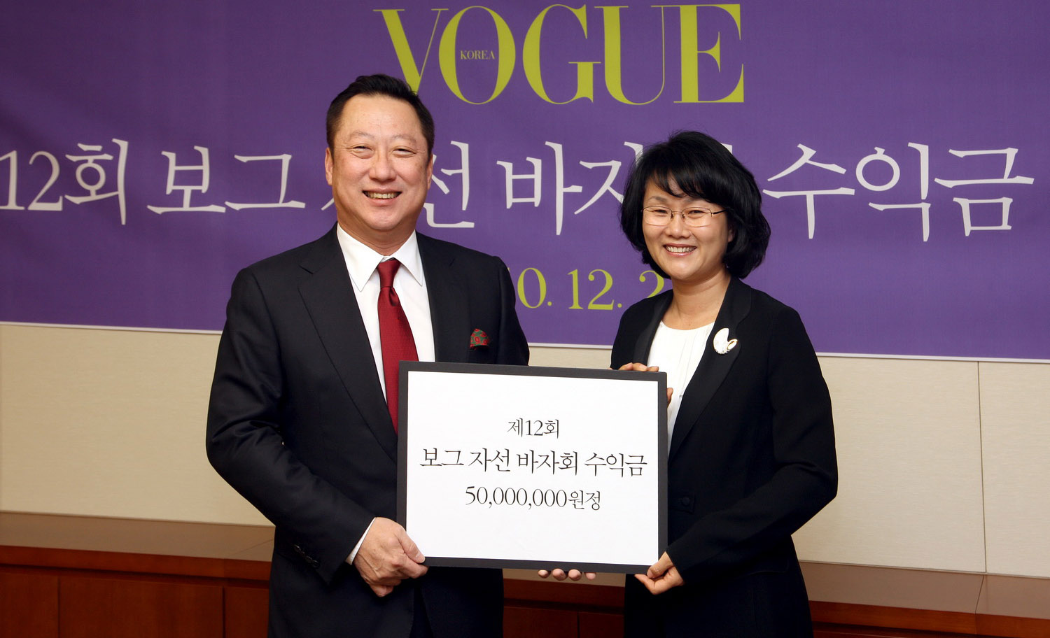 두산매거진(발행인 박용만 사진 좌측)은 21일, 서울 을지로 두산타워에서 '제 12회 보그 자선 바자회'에서 거둔 수익금 5천만원을 사단법인 부스러기사랑나눔회(대표: 이경림)에 전달했다.