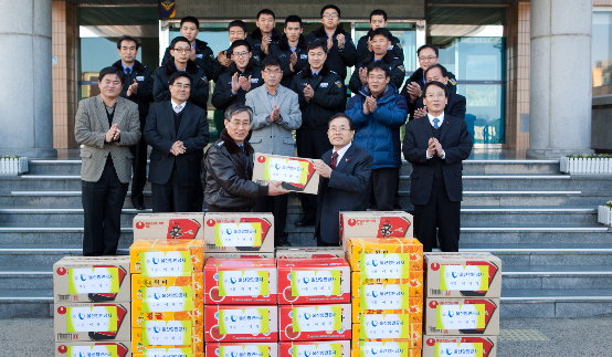 울산항만공사 이채익 사장(사진 우측)이 울산해양경찰서 김광준 서장(좌)에게 위문품을 전달하고 있다.