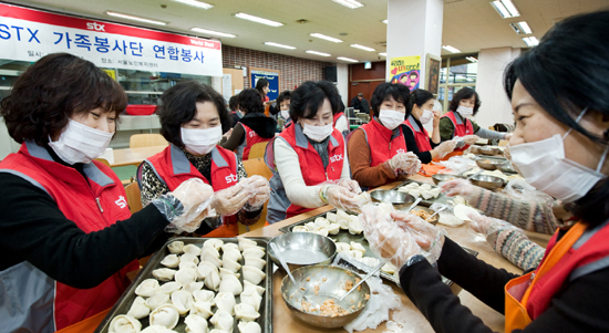 STX그룹의 재경지역 임원 배우자들로 구성된 STX 가족봉사단 70여명은 설을 앞두고 종로구 서울노인복지센터에서 노인 분들을 위한 떡국만두 빚기 행사를 가졌다.
