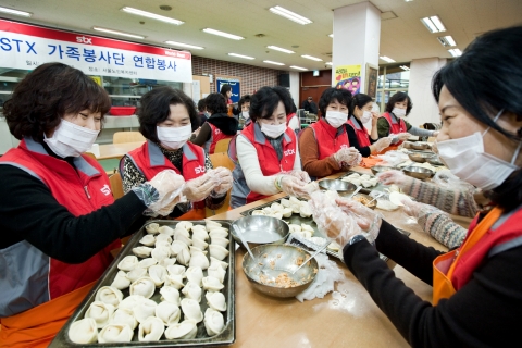 STX그룹의 재경지역 임원 배우자들로 구성된 STX 가족봉사단 70여명은 설을 앞두고 종로구 서울노인복지센터에서 노인 분들을 위한 떡국만두 빚기 행사를 가졌다.