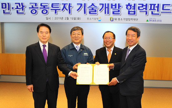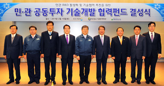 협약에 따르면, 현대중공업과 중소기업청은 앞으로 중소기업의 국산화 및 신제품 개발 비용을 개발 과제당 10억 원 한도 내에서 최대 75%까지 지원하게 된다. 또, 현대중공업은 2·3차 협력사로 동반성장 정책을 확대하고, 중소기업에 대한 품질 및 기술개발 지원도 강화해나가기로 약속했다. (사진: ‘민∙관 공동 기술개발 펀드’ 협약식 참석자들의 모습)