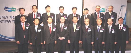 (사진:심규상 두산중공업 운영 총괄사장(COO), 슈테펜 라이헤(Steffen Reiche), 김정관 지식경제부 에너지자원실장 등 70여명이 15일 강남구 역삼동에 위치한 리츠칼튼 호텔에서 국제인증 수여식에 참가해 기념 촬영을 하고 있다. 앞줄 왼쪽 세번째부터 김정관 지식경제부 에너지자원실장, 슈테펜 라이헤(Steffen Reiche) DEWI-OCC 부사장, 심규상 두산중공업 운영총괄사장(COO).