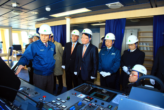 이 선박통합통신망(SAN)을 통해 수집·분석·가공한 정보는 선박의 경제적 운항관리는 물론 선박 내 기자재의 재고관리 등 차세대 부가서비스로 연동이 가능하다.(사진:선박 조타실에서 현대중공업 관계자로부터 스마트십에 관한 설명을 듣고 있는 김흥남 ETRI원장(왼쪽 2번째), 지식경제부 조석 성장동력실장(왼쪽 3번째), 현대중공업 황시영 통합전산실장(부사장/왼쪽 4번째), 울산대학교 이철 총장(오른쪽 첫번째/서있는 사람)