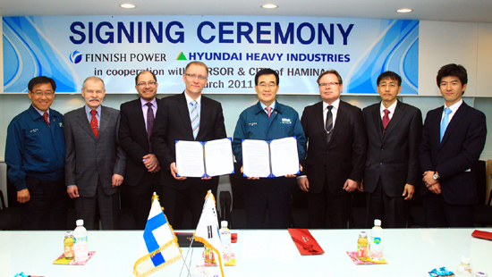 현대중공업은 최근 울산 본사에서 김권태 부사장과 핀란드 전력회사인 피니시 파워(Finnish Power)社 유시 레토(Mr. Jussi Lehto) 회장, 하미나(Hamina)시(市) 하누 무호넨(Mr. Hannu Muhonen) 시장 등 10여 명이 참석한 가운데 계약 서명식을 가졌다고 6일(수) 밝혔다.