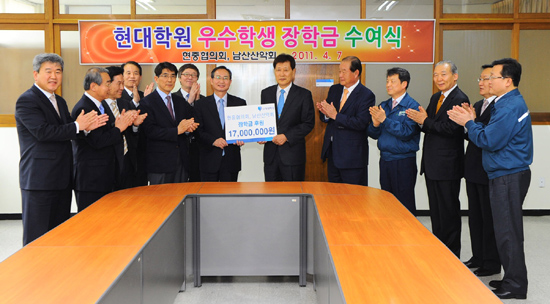 현대중공업 협력회사 협의체인 ‘현중협의회(회장: 宋政錫 (주)삼강금속 대표이사)’와 협력회사 동호회인 ‘남산산악회(회장: 張泳郁 삼전기술검사(주) 대표이사)’는 7일(목) 오후 울산 동구 현대청운고등학교에서 장학금 전달식을 갖고, 지역의 5개 중 고등학교에 장학금 1천700만원을 전달했다. (사진:장학금 후원 증서를 전달하고, 받는 현중협의회 송정석 회장(증서를 든 오른쪽)과 현대청운고등학교 현영길 교장(증서를 든 왼쪽)