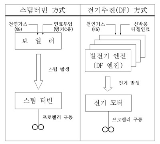 전기추진방식 LNG선은 천연가스와 선박용 디젤연료를 모두 사용할 수 있는 DF(Dual Fuel)엔진에서 전력을 생산한 뒤, 이를 이용해 전기모터를 돌려 구동하는 LNG선을 말한다.