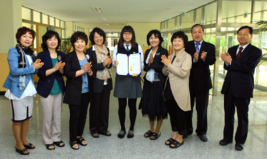 장학생들은 가정형편은 어렵지만, 학업성적이 우수하고 학교생활이 모범적인 학생들로, 각 학교의 추천을 받아 선정됐다. (사진 : 현중어머니회 장학금 전달식에 참석한 성명화 회장(왼쪽에서 세번째), 안효대 국회의원 부인 박혜경 여사(왼쪽 네번쨰), 남목고등학교 교장(오른쪽에서 두번째).