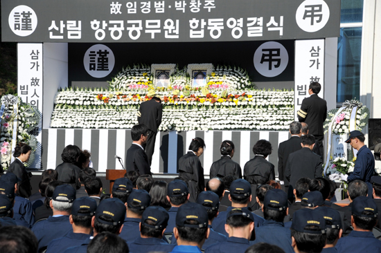 이날 이에 앞서 임경범(49) 기장과 박창주(56) 정비실장의 영결식이 오전 강원도 강릉 안현동 강릉장례식장에서 산림청장으로 엄수됐다.